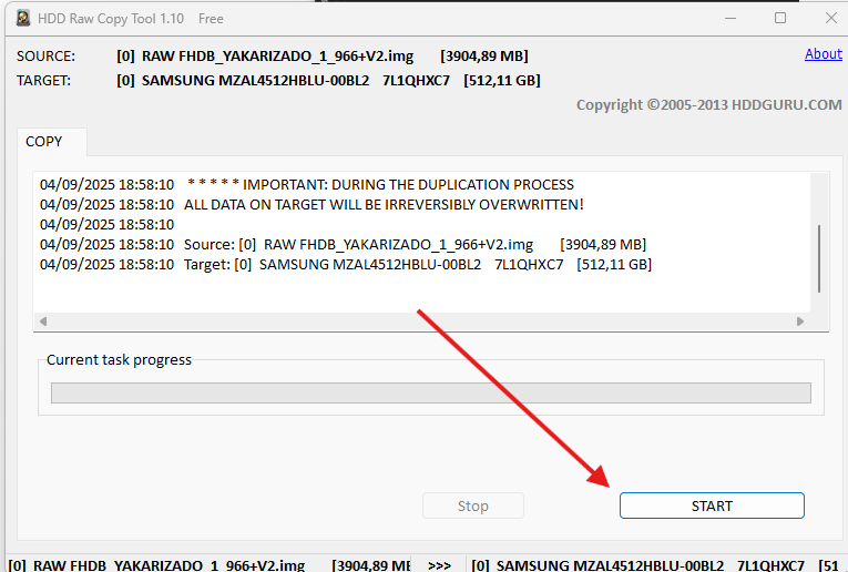 Una vez tenemos el archivo y el disco seleccionados, hacemos clic en START.